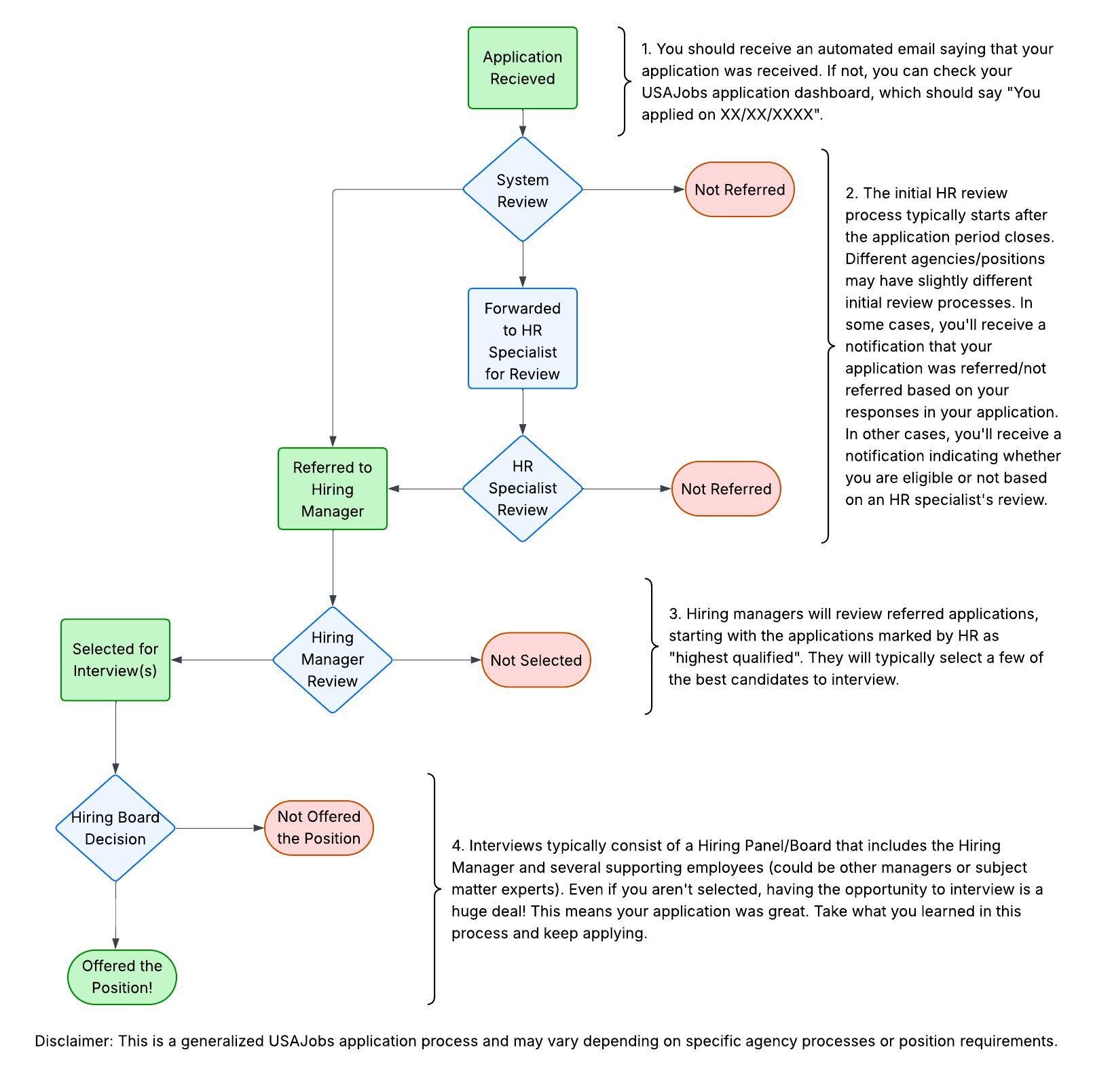 Here’s a breakdown of the general application workflow. The green and red objects indicate when you’ll typically get a notification. Just keep in mind that this process and the types of notifications you may receive are agency/position dependent.